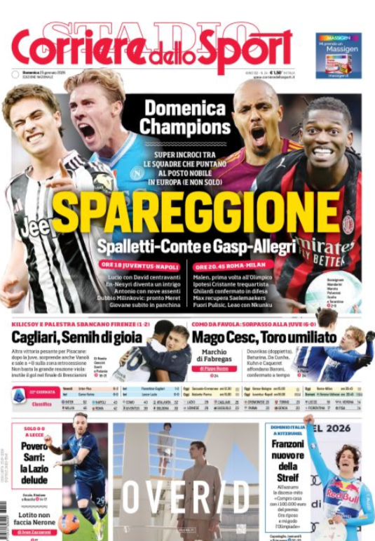 Questa è la prima pagina di 'Corriere dello Sport', in edicola oggi, domenica 25 gennaio 2026. Diamo un’occhiata alle principali novità sul mondo dello sport e in particolare del calcio, cercando di evidenziare le notizie sul Milan.
