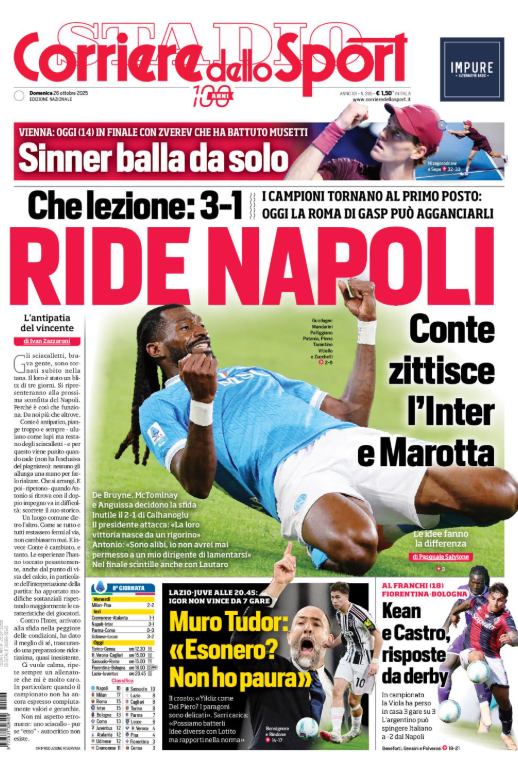 Questa è la prima pagina di 'Corriere dello Sport', in edicola oggi, domenica 26 ottobre 2025. Diamo un’occhiata alle principali novità sul mondo dello sport e in particolare del calcio, cercando di evidenziare le notizie sul Milan.