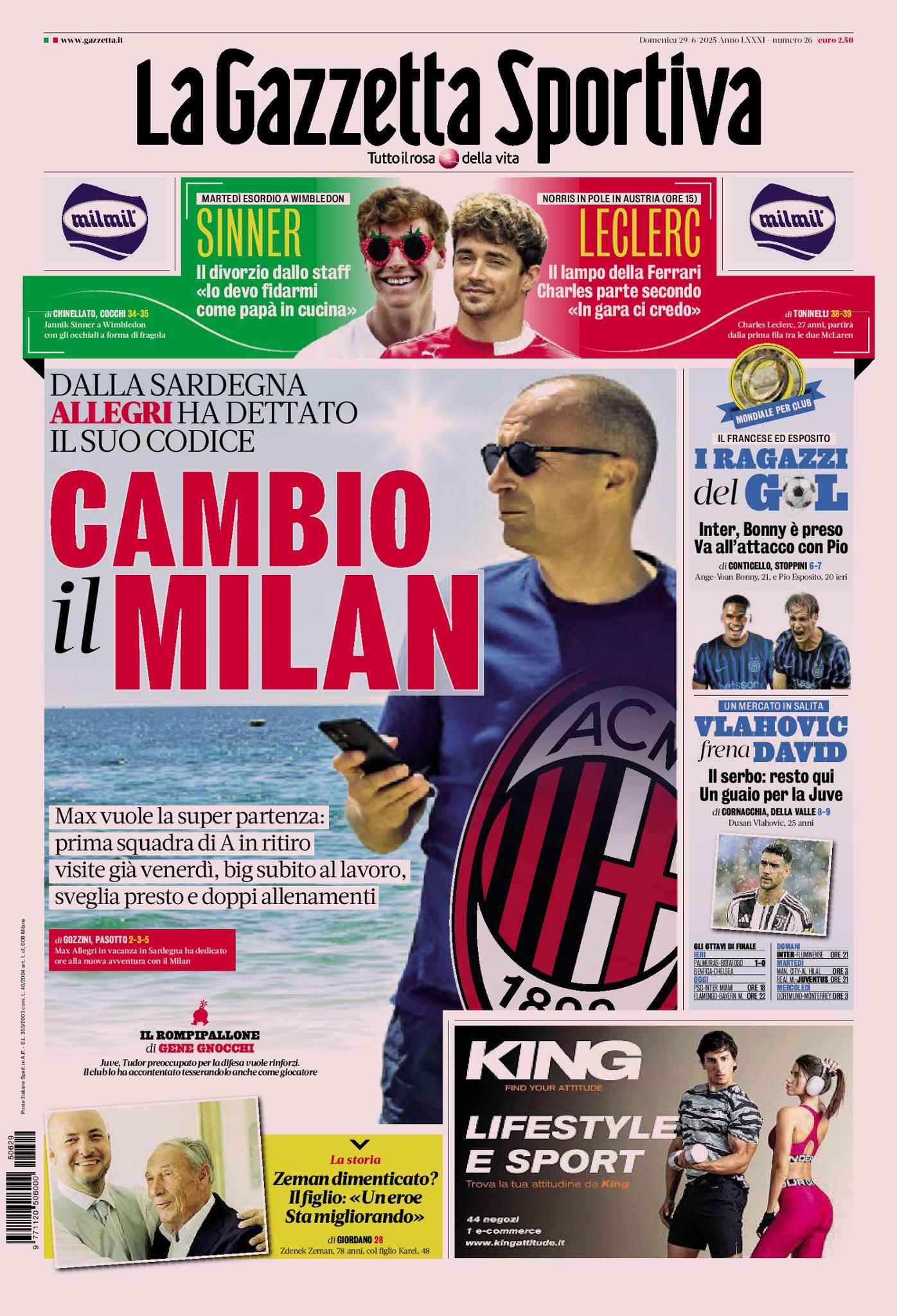 L'Inter cambia il suo attacco: dietro i titolari Lautaro Martínez e Marcus Thuram, resterà Francesco Pio Esposito che sarà raggiunto da Ange-Yoan Bonny, in arrivo dal Parma. Grana Dušan Vlahović alla Juventus: il serbo vuole restare fino alla scadenza del suo contratto (30 giugno 2026) e blocca, così, l'arrivo di Jonathan David in bianconero. Il figlio di Zdenek Zeman aggiorna tutti sulle condizioni di salute del padre.