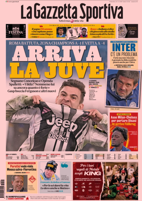 La prima pagina de 'La Gazzetta dello Sport' apre con la Serie A. Arriva la Juve. Vittoria cruciale contro la Roma. Inter c'è un problema. Supercoppa, finale tra Napoli e Bologna. Asse Milan-Chelsea per Disasi. Fullkrug in arrivo. Paratici vede la Fiorentina. Ecco la prima pagina de 'La Gazzetta dello Sport'.