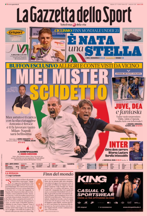 La prima pagina de 'La Gazzetta dello Sport' apre con l'intervista a Buffon su Allegri, Conte e Milan-Napoli. Juventus, Dea e fantasia. Inter, Chivu deve correre. Torna Lautaro. Ecco la prima pagina de 'La Gazzetta dello Sport'.