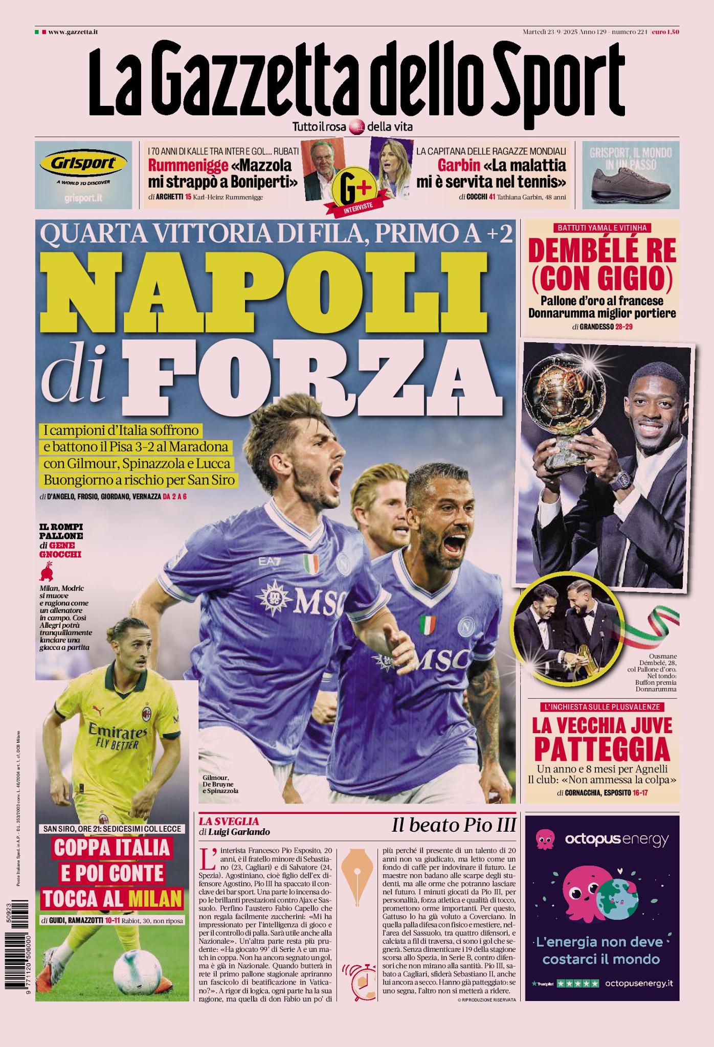 Stasera, alle ore 21:00, il Milan di Massimiliano Allegri - prossimo avversario del Napoli in campionato - sfiderà il Lecce di Eusebio Di Francesco per il secondo turno della Coppa Italia 2025-2026. Intanto, la vecchia dirigenza della Juventus patteggia per l'inchiesta sulle plusvalenze: un anno e 8 mesi per l'ex Presidente Andrea Agnelli.