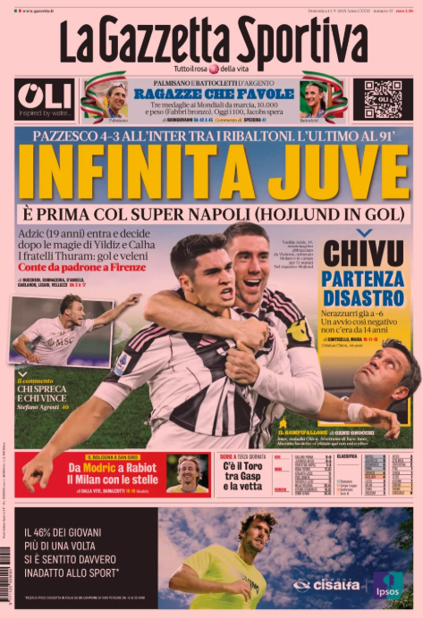 La prima pagina de 'La Gazzetta dello Sport' apre con la vittoria della Juventus contro l'Inter. Infinita Juve. Napoli vittorioso contro la Fiorentina. Conte da padrone a Firenze. C'è il Torino tra la Roma e la vetta. Da Modric a Rabiot. Il Milan con le stelle. Ecco la prima pagina de 'La Gazzetta dello Sport'.