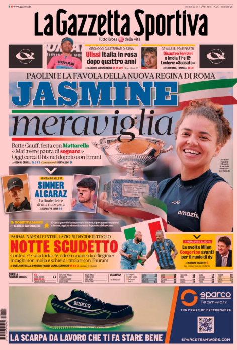 La prima pagina de 'La Gazzetta dello Sport' apre con la vittoria a Roma di Paolini. Oggi Sinner-Alcaraz. Napoli e Inter, notte Scudetto. DS Milan, svolta Congerton. E' avanti. Ecco la prima pagina de 'La Gazzetta dello Sport'.