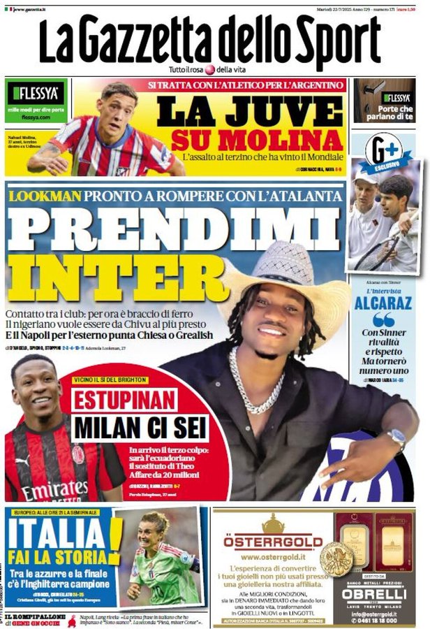 Il Milan ha quasi preso Pervis Estupiñán dal Brighton, come sostituto di Theo Hernández, in un affare da 20 milioni di euro, mentre la Juventus, per il ruolo di terzino destro, ora punta Nahuel Molina dell'Atlético Madrid. Europei di calcio femminile: stasera, alle ore 21:00, semifinale tra Inghilterra e Italia.