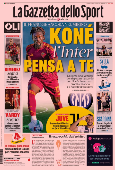 La prima pagina de 'La Gazzetta dello Sport' apre con il mercato. Koné l'Inter pensa a te. Spazio al Milan. Gimenez segna, Milan eccomi. Vardy sogna con la Cremonese. Juventus, Bremer l'anti Thu-La. In Italia si gioca meno. Ecco la prima pagina de 'La Gazzetta dello Sport'.