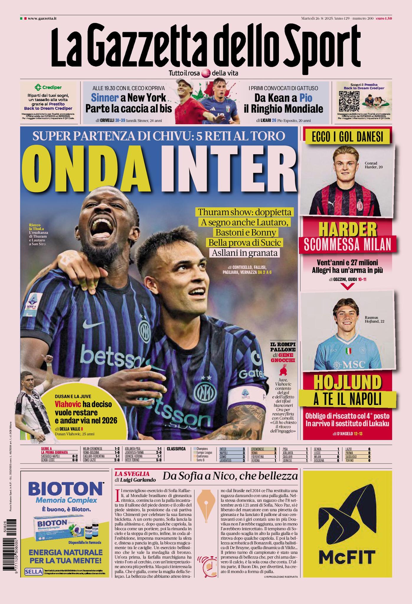 Spazio, poi, al calciomercato, visto che entriamo nell'ultima settimana. Dušan Vlahović ha deciso di restare alla Juventus e di andare via nel 2026. Il Milan, dunque, per il suo attacco investe 27 milioni di euro sul 20enne danese Conrad Harder: una scommessa per Massimiliano Allegri.