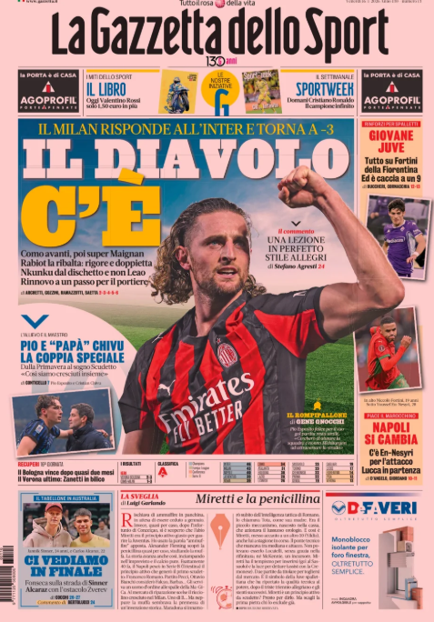 La prima pagina de 'La Gazzetta dello Sport' apre con la rimonta del Milan sul campo del Como. Il Diavolo c'è. Il Milan risponde all'Inter. Giovane Juve. Tutto su Fortini. Napoli si cambia, c'è En-Nesyri. Pio e papà Chivu. Ecco la prima pagina de 'La Gazzetta dello Sport'.
