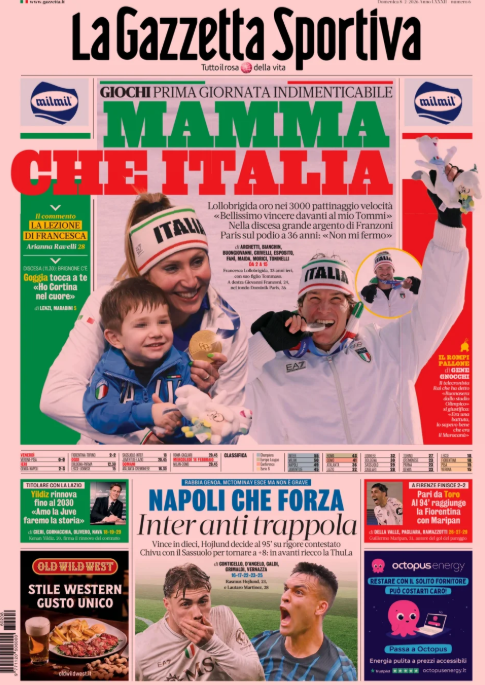 La prima pagina de 'La Gazzetta dello Sport' apre con le Olimpiadi invernali: "Mamma che Italia". Napoli che forza. Inter anti trappola. Yildiz rinnova. Pari tra Torino e Fiorentina. Ecco la prima pagina de 'La Gazzetta dello Sport'.