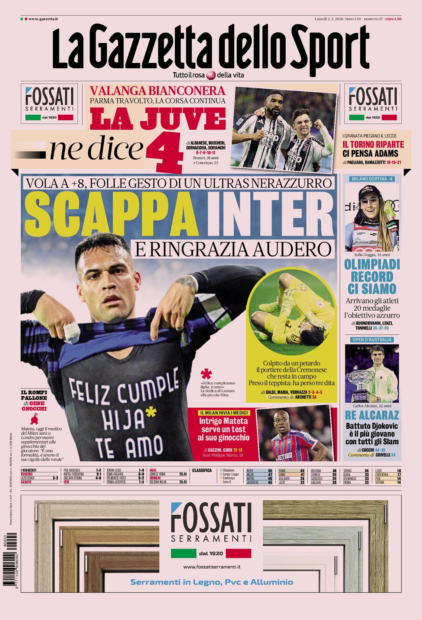 In alto, sotto la testata, si parla di un'altra vittoria esterna di questo turno di Serie A, quella della Juventus di Luciano Spalletti. I bianconeri passano in scioltezza, 4-1, sul campo del Parma. Spicca, nel poker della 'Vecchia Signora' al 'Tardini', la doppietta del difensore centrale brasiliano Gleison Bremer.