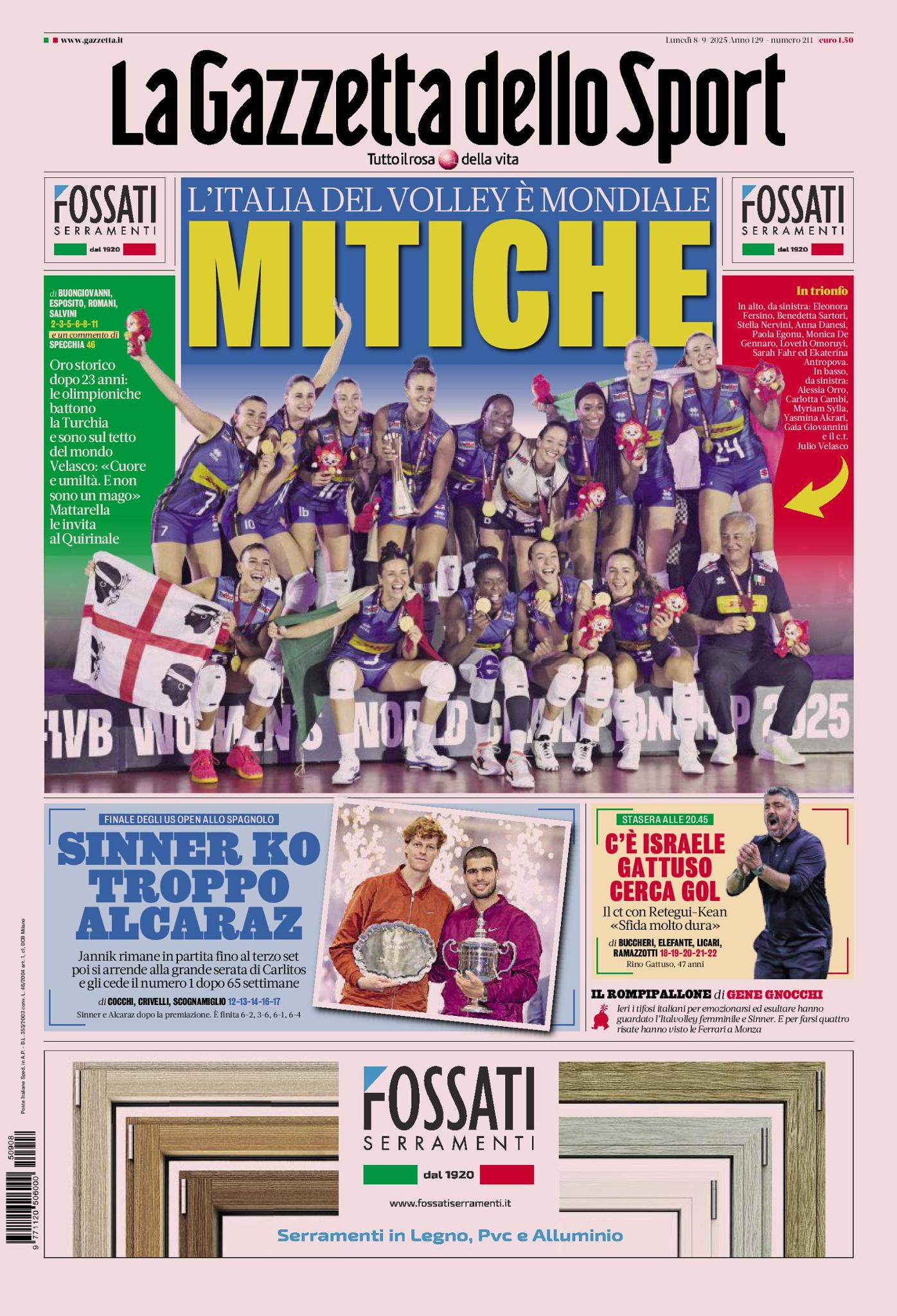 Agli US Open di tennis, invece, il nostro Jannik Sinner ha perso, 1-3, contro lo spagnolo Carlos Alcaraz: sfumato il torneo per l'altoatesino, oltre che la posizione di numero uno al mondo, ora nelle mani del rivale.