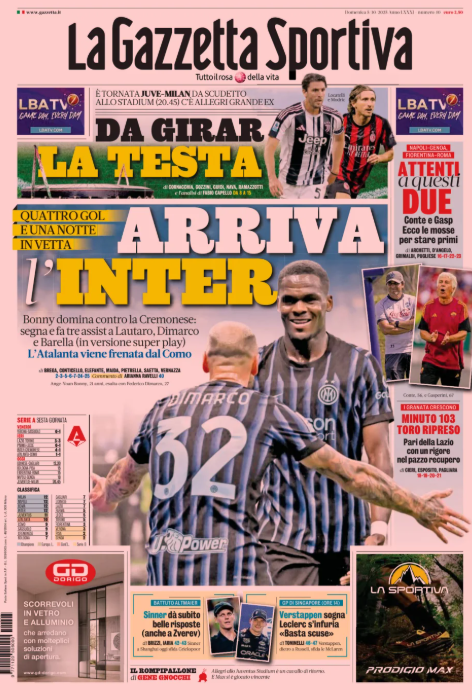 La prima pagina de 'La Gazzetta dello Sport' apre con la vittoria per 4-0 dell'Inter sulla Cremonese. Juventus-Milan da girar la testa. Attenti a Conte e Gasperini. La Lazio riprende il Torino al minuto 103. Ecco la prima pagina de 'La Gazzetta dello Sport'.