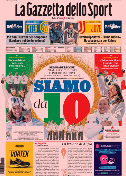 Questa è la prima pagina de 'La Gazzetta dello Sport', in edicola oggi, sabato 21 febbraio 2026. Diamo un’occhiata alle principali novità sul mondo dello sport e in particolare del calcio, cercando di evidenziare le notizie sul Milan.