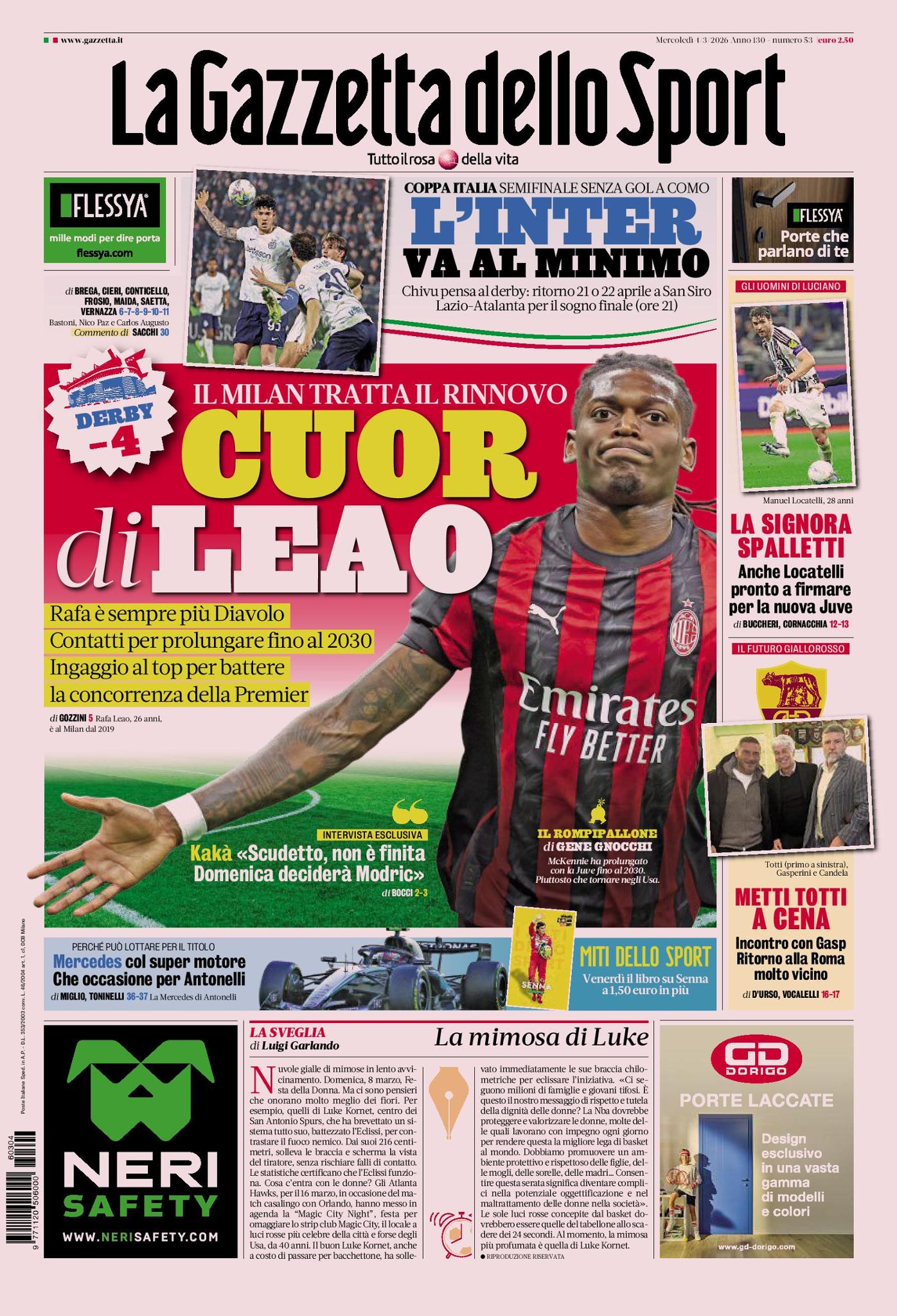 Mancano, intanto, quattro giorni al derby di Milano e della sfida ha parlato, in esclusiva alla 'rosea', l'ex rossonero Ricardo Kaká: il brasiliano vede Luka Modrić decisivo nel match di domenica sera contro l'Inter. I nerazzurri, intanto, hanno giocato ieri sera al 'Sinigaglia' di Como l'andata delle semifinali di Coppa Italia: scialbo 0-0, giocatori ed energie risparmiate per il derby.
