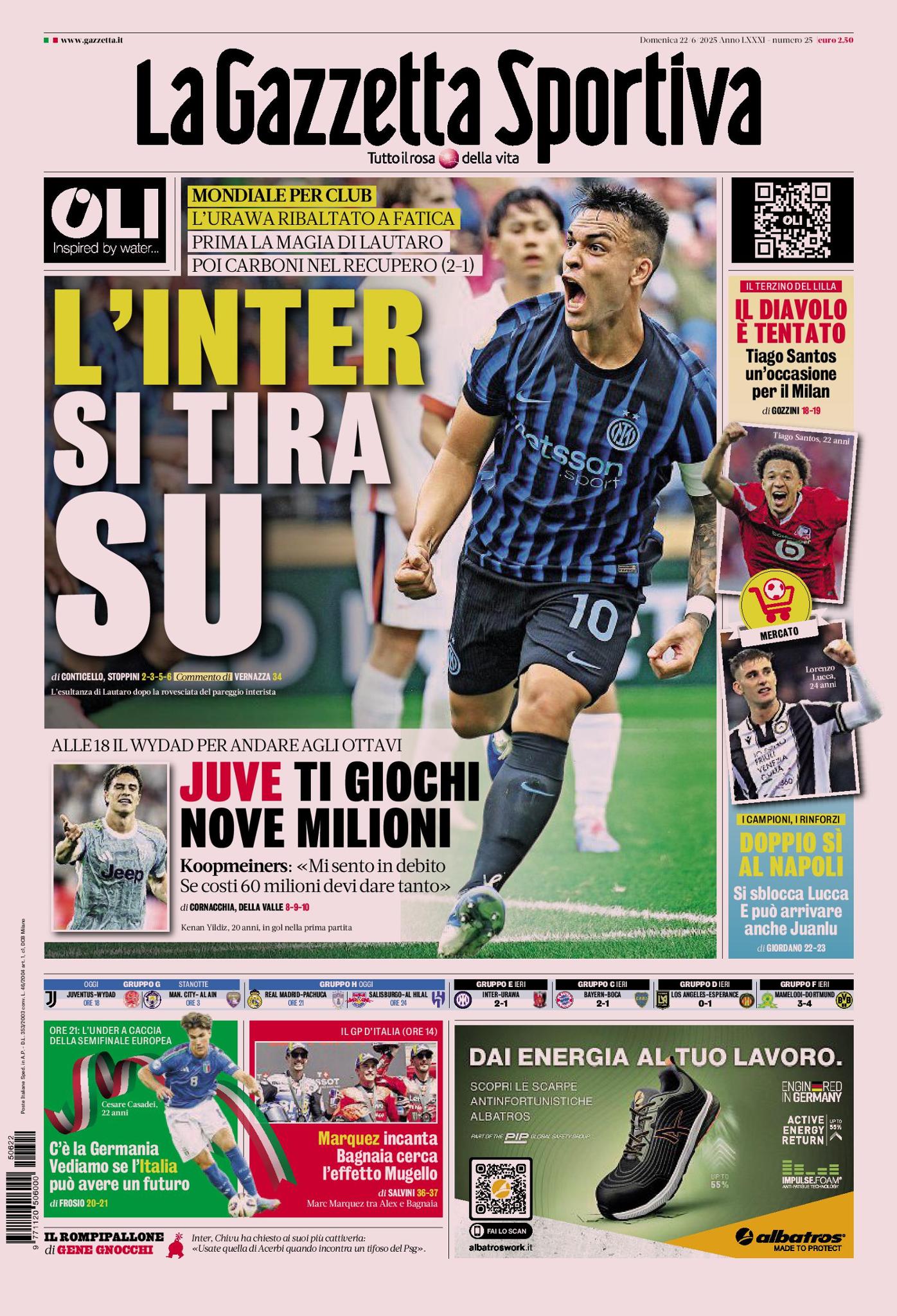 'La Gazzetta dello Sport' apre con l'Inter e con la rimonta rischiosa attuata nel match del Mondiale per Club contro gli Urawa Red Diamonds, arrivata solamente nel recupero grazie ad una rete di Valentin Carboni. Non solo, perché si parla anche del match della Juventus contro il Wydad e vengono riportate alcune dichiarazioni di Teun Koopmeiners. Infine, nella parte bassa, spazio all'Italia Under 21 che si gioca un posto in semifinale contro la Germania all'Europeo di categoria.
