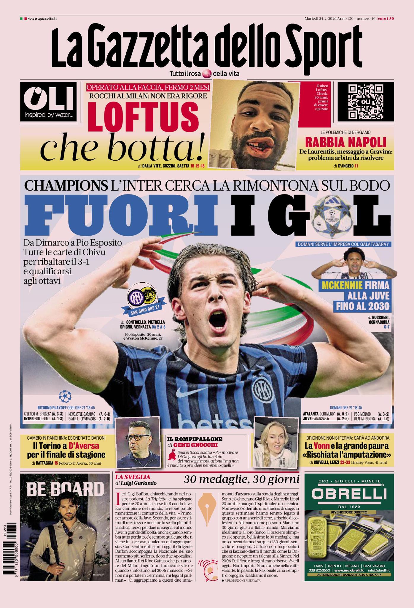 In alto, sotto la testata, l'esito dell'operazione a Ruben Loftus-Cheek, centrocampista del Milan, operato ieri in faccia dopo lo scontro con Edoardo Corvi, portiere del Parma, nel corso dell'ultimo match di campionato. Starà fermo due mesi. Ma per Gianluca Rocchi, designatore arbitrale, quello scontro lì non era punibile con il calcio di rigore.