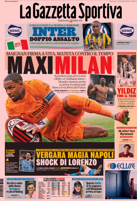 La prima pagina de 'La Gazzetta dello Sport' apre con il calciomercato. Maxi Milan: Maignan firma a vita, Mateta contro il tempo. Inter doppio assalto: Diaby e la Cremonese nel mirino. Yildiz fino al 2030. Il Napoli vince contro la Fiorentina. Ecco la prima pagina de 'La Gazzetta dello Sport'.
