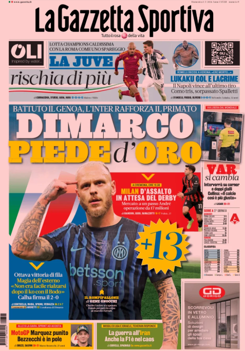 Questa è la prima pagina de 'La Gazzetta dello Sport', in edicola oggi, domenica primo marzo 2026. Diamo un’occhiata alle principali novità sul mondo dello sport e in particolare del calcio, cercando di evidenziare le notizie sul Milan.