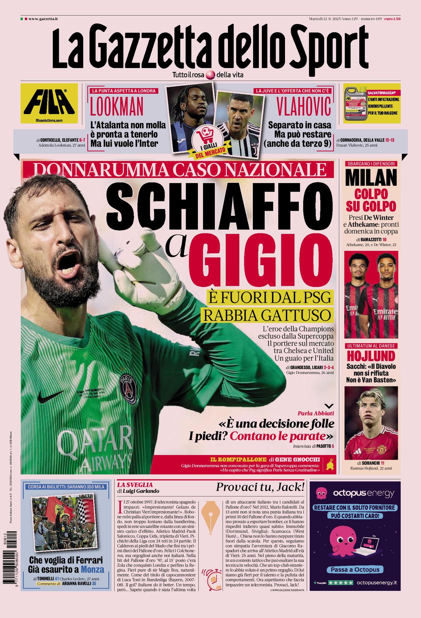 In alto, poi, sotto la testata, due spinosi casi di calciomercato dell'estate 2025, ovvero Ademola Lookman e Dušan Vlahović. L'Atalanta vorrebbe tenere l'attaccante nigeriano, ma lui pensa ancora di andare all'Inter. Il bomber serbo, in mancanza di offerte concrete, potrebbe rimanere alla Juventus per un'altra stagione, anche come terza scelta per l'attacco, andando via a parametro zero dal 1° luglio 2026.