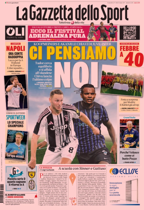 La prima pagina de 'La Gazzetta dello Sport' apre con la sfida tra Juvnetus e Inter. Ci pensiamo noi. Ecco il festival. Adrenalina pura. Presente anche Ibrahimovic. Napoli, ora Conte raddoppia. Festa a sorpresa per Modric. Rabiot al top. Ecco la prima pagina de 'La Gazzetta dello Sport'.