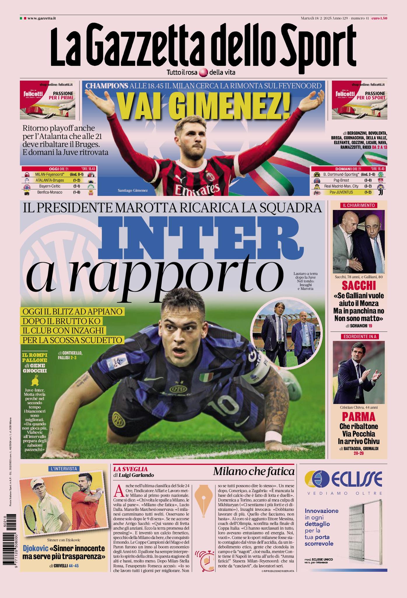 In alto, sotto la testata, si parla delle partite di ritorno dei playoff della Champions League 2024-2025 in programma. Milan-Feyenoord, alle ore 18:45, con i rossoneri che si affideranno all'ex di turno, Santiago Giménez, per cercare di ribaltare lo 0-1 incassato all'andata in Olanda. Poi, Atalanta-Bruges, alle ore 21:00, con la 'Dea' chiamata rimontare dal k.o per 1-2 rimediato in Belgio.