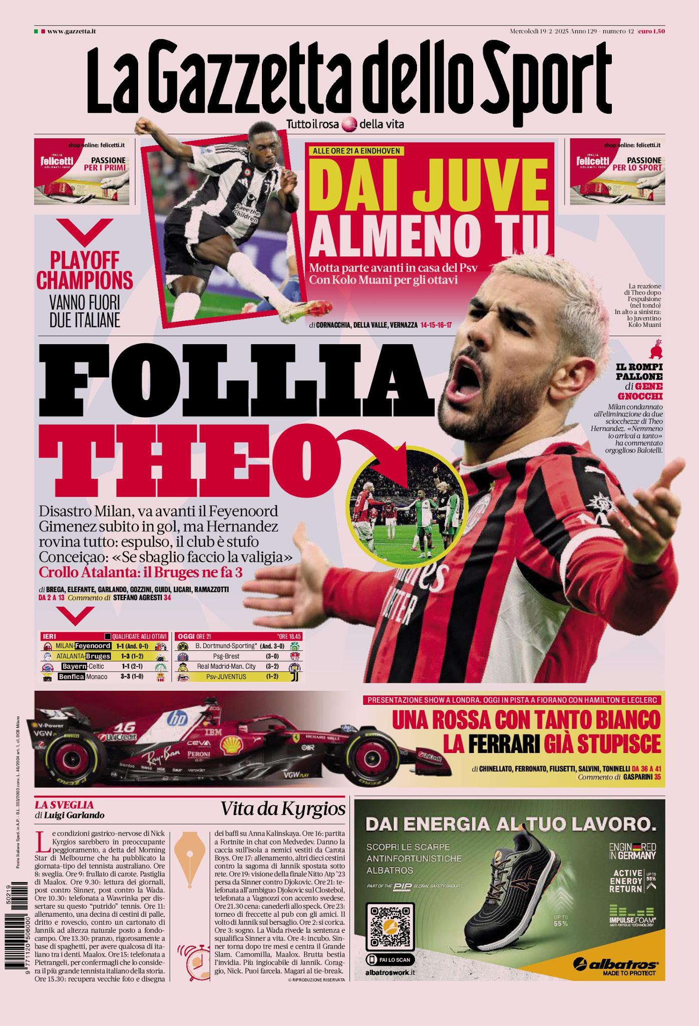 Il club è stufo degli atteggiamenti e delle prestazioni del terzino francese, anche se il tecnico Sérgio Conceição ci mette la faccia e prova a prendersi la responsabilità dell'eliminazione dei rossoneri. Va fuori anche l'Atalanta di Gian Piero Gasperini, che perde un'altra volta, stavolta 1-3 al 'Gewiss Stadium', contro il Bruges. Sotto la testata, quindi, la 'rosea' si augura che almeno la Juventus, impegnata stasera sul campo del PSV Eindhoven e in vantaggio 2-1 dopo il match d'andata, approdi agli ottavi del torneo.