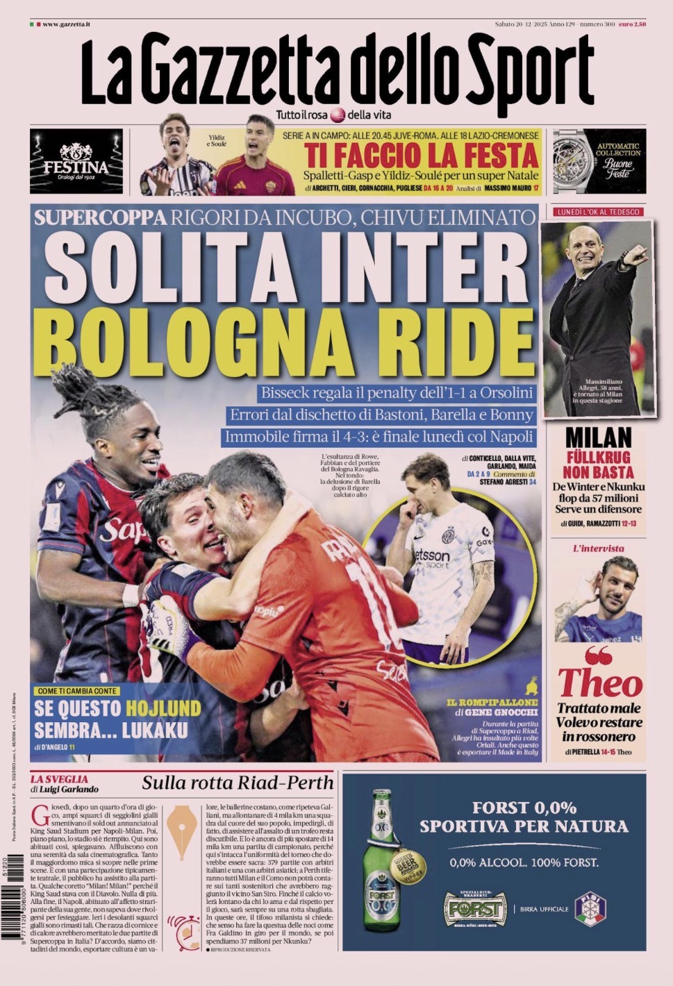 La prima pagina de 'La Gazzetta dello Sport' apre con l'Inter, eliminata in Coppa Italia dal Bologna di Vincenzo Italiano. Spazio al Milan con l'Inter ista all'ex terzino rossonero Theo Hernandez, che è tornato a parlare della sua cessione.