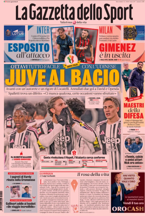 La prima pagina de 'La Gazzetta dello Sport' apre con la vittoria della Juventus in Coppa Italia contro l'Udinese. Inter Esposito all'attacco. Milan, Gimenez è in uscita. Maestri della difesa. I segreti di Vardy rinato alla Cremonese. Ecco la prima pagina de 'La Gazzetta dello Sport'.