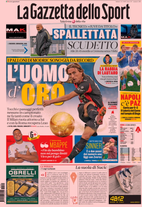 La prima pagina de 'La Gazzetta dello Sport' apre con il Milan. I palloni di Modric sono già record. L'uomo d'oro. Spallettata da Scudetto. La rabbia di Lautaro. Napoli c'è Nico Paz. L'intervista a Mbappé. Ecco la prima pagina de 'La Gazzetta dello Sport'.