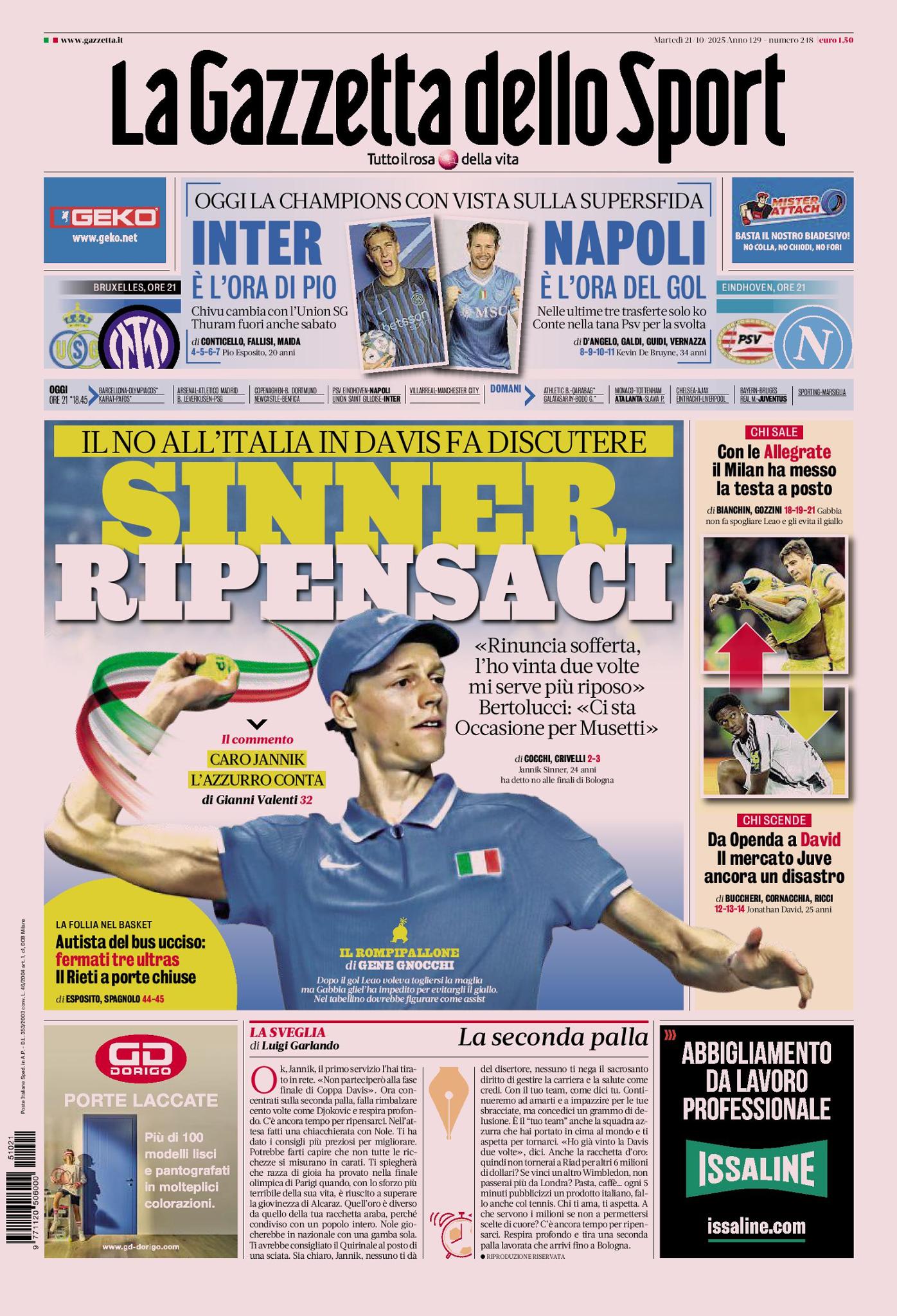 Quindi, in alto, sotto la testata, si parla di Champions League. Alle ore 21:00, infatti, sarà la volta di PSV Eindhoven-Napoli e Union Saint-Gilloise-Inter per la terza giornata della Fase Campionato. Gli azzurri di Antonio Conte vanno alla caccia del gol perduto; i nerazzurri di Cristian Chivu riproporranno in attacco il giovane Francesco Pio Esposito.