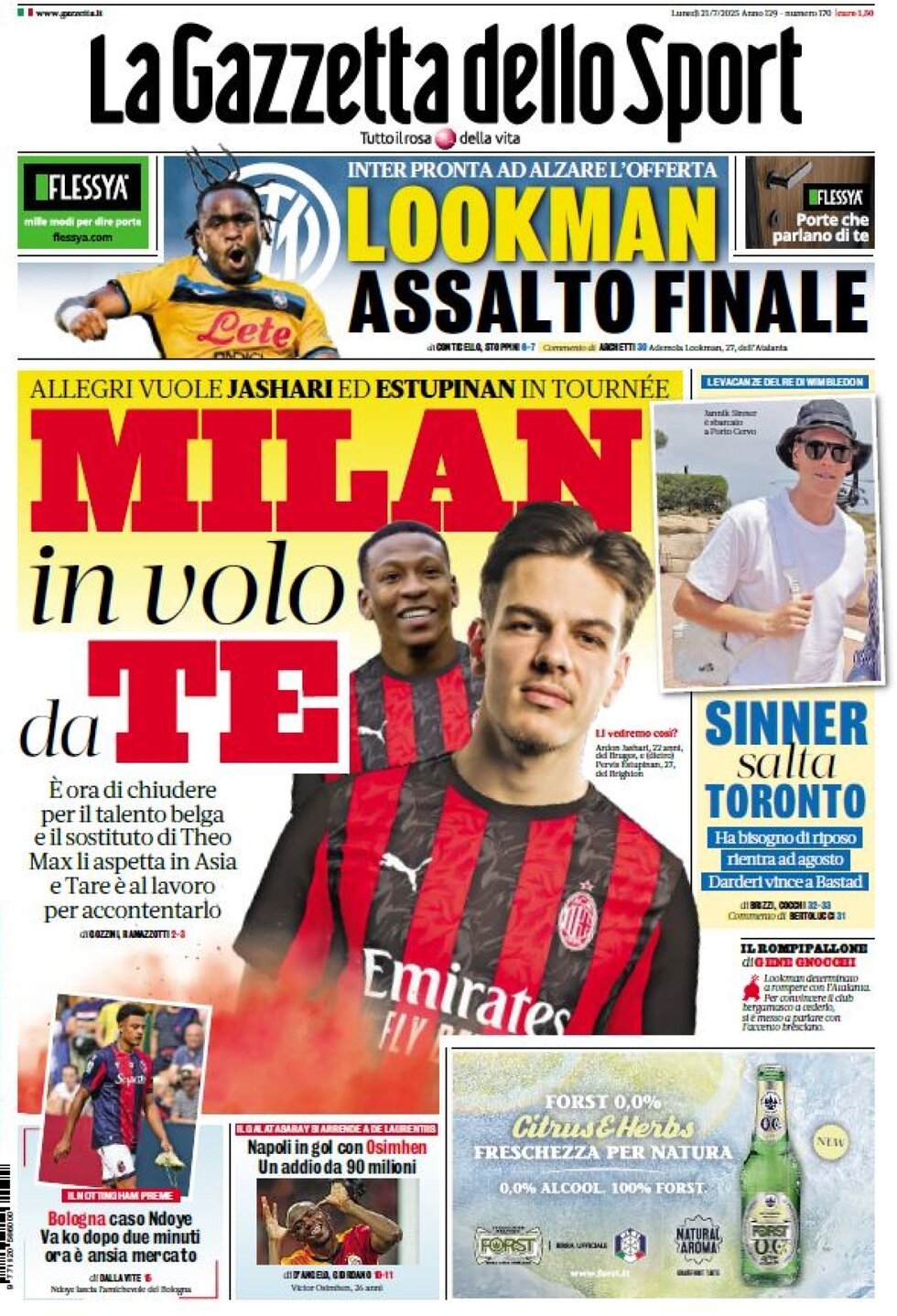 In alto, sotto la testata, si parla della trattativa che potrebbe portare Ademola Lookman dall'Atalanta all'Inter. I meneghini pronti ad alzare la propria offerta per mettere le mani sull'attaccante nigeriano. Victor Osimhen, suo connazionale, passa invece - finalmente - dal Napoli al Galatasaray: un addio da 90 milioni di euro! Ansia in casa Bologna dopo l'infortunio di Dan Ndoye in amichevole: salta il suo trasferimento al Nottingham Forest?