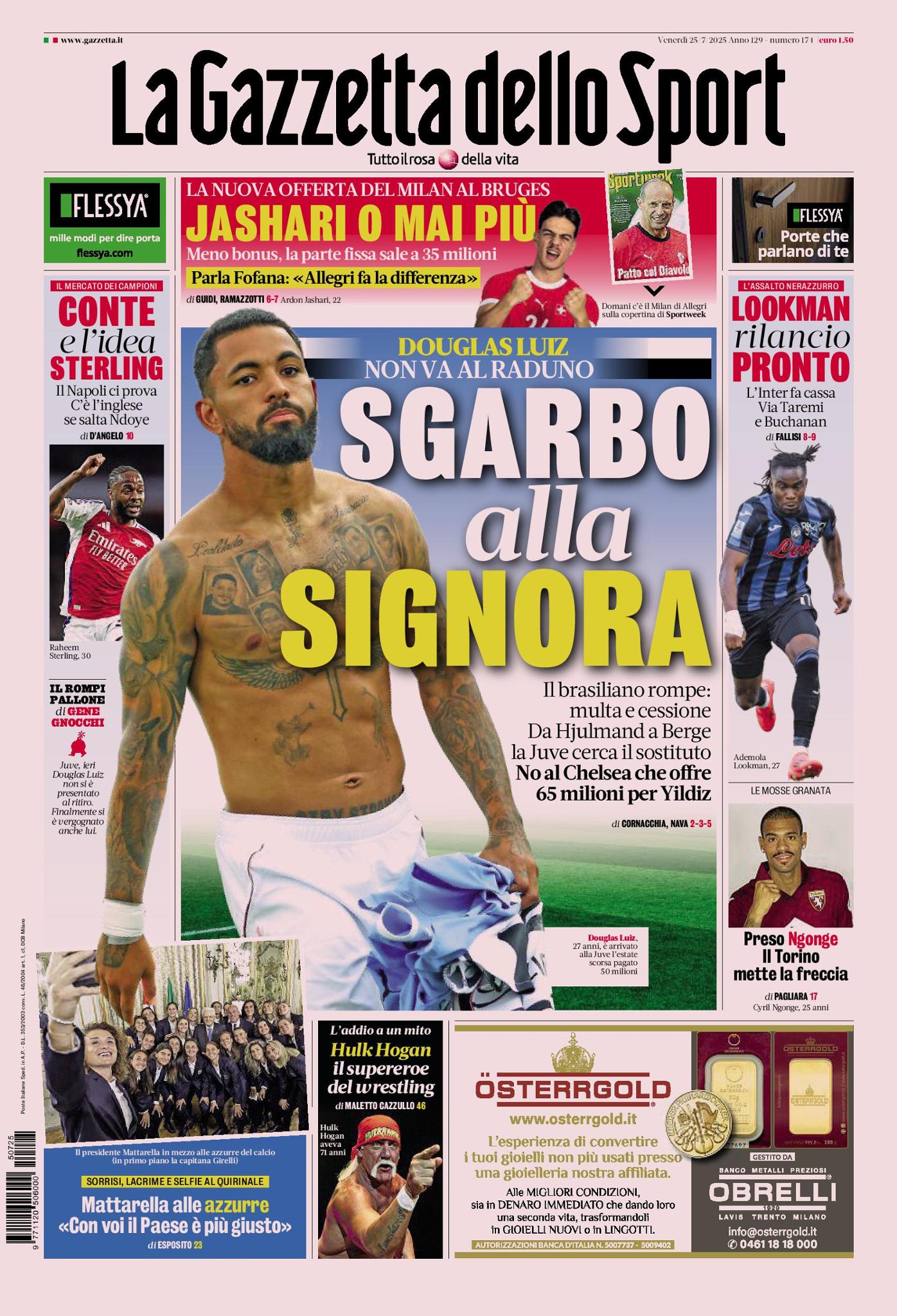 In alto, sopra la testata, l'ultima evoluzione della trattativa tra Bruges e Milan per Ardon Jashari: i rossoneri salgono a 35 milioni di euro di parte fissa, si può chiudere. Parla Youssouf Fofana: subito lodi per mister Massimiliano Allegri. Il Napoli di Antonio Conte pensa a Raheem Sterling del Chelsea come rinforzo per le corsie esterne in attacco.