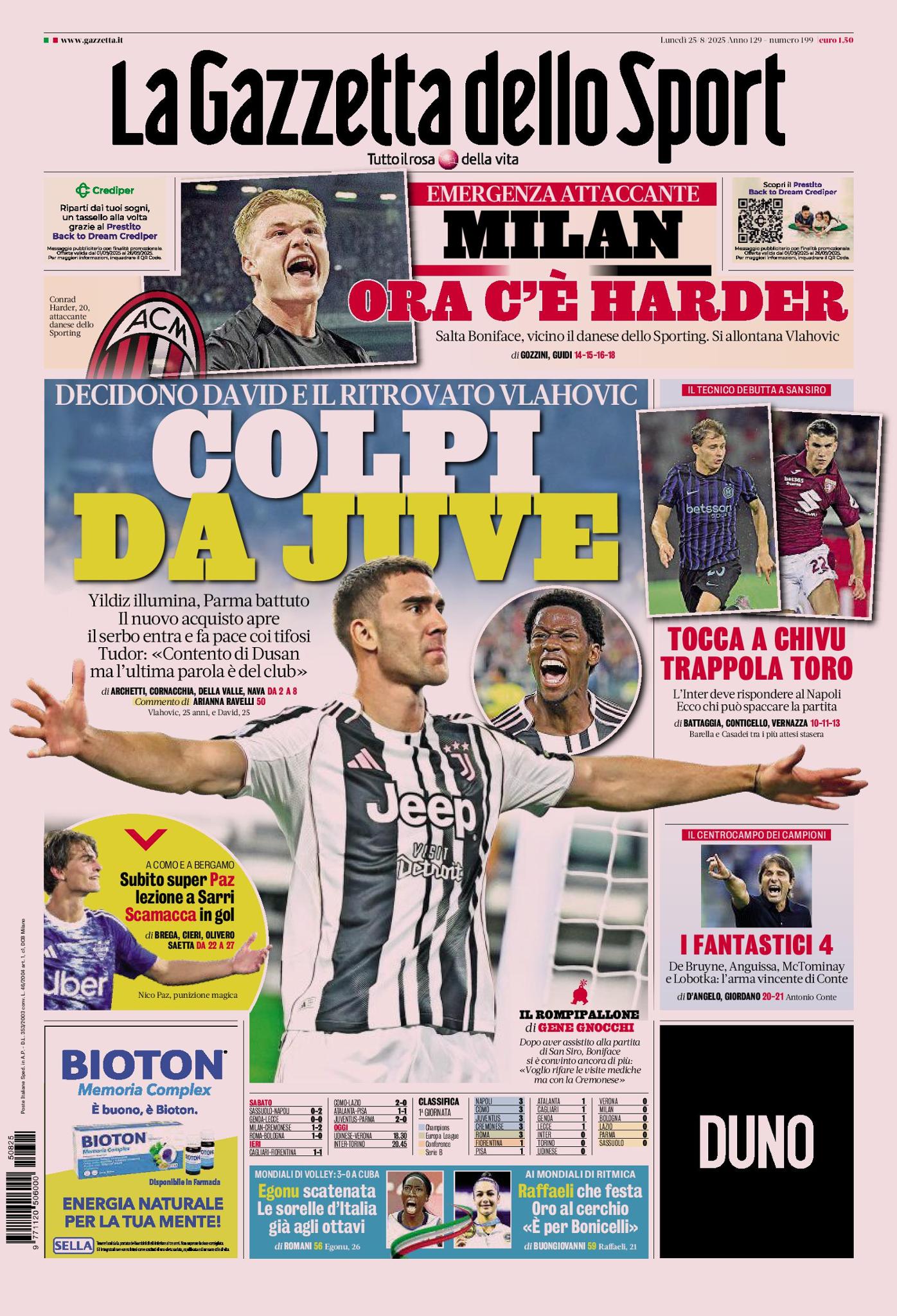 Quest'ultimo, obiettivo di calciomercato del Milan, si allontana dai rossoneri: il club di Via Aldo Rossi - saltato l'affare Victor Boniface - sta infatti chiudendo, in attacco, per Conrad Harder, 20enne danese dello Sporting Lisbona. Nelle altre partite disputate ieri, Como-Lazio 2-0 con assist e gol spaziali per Nico Paz e Atalanta-Pisa 1-1.