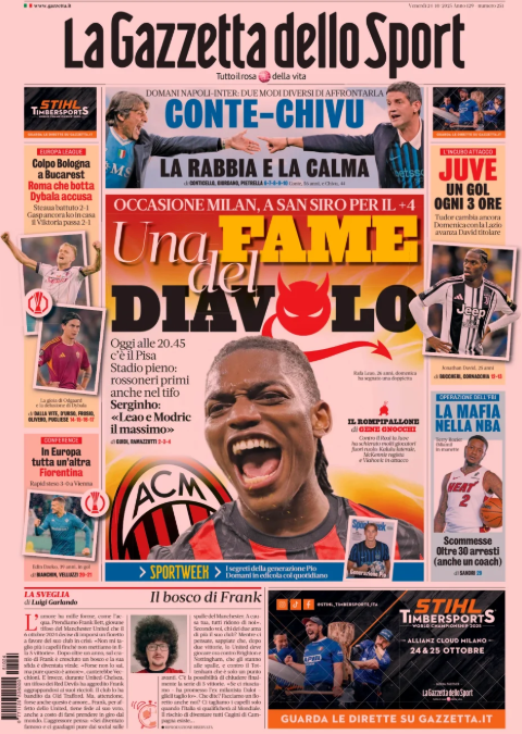 La prima pagina de 'La Gazzetta dello Sport' apre con il Milan. Una fame del Diavolo. Occasione Milan, a San Siro con il Pisa per il più 4. Conte-Chivu, la rabbia e la calma. Colpo Bologna in Europa League. Cade la Roma Juventus, un gol ogni 3 ore. Ecco la prima pagina de 'La Gazzetta dello Sport'.