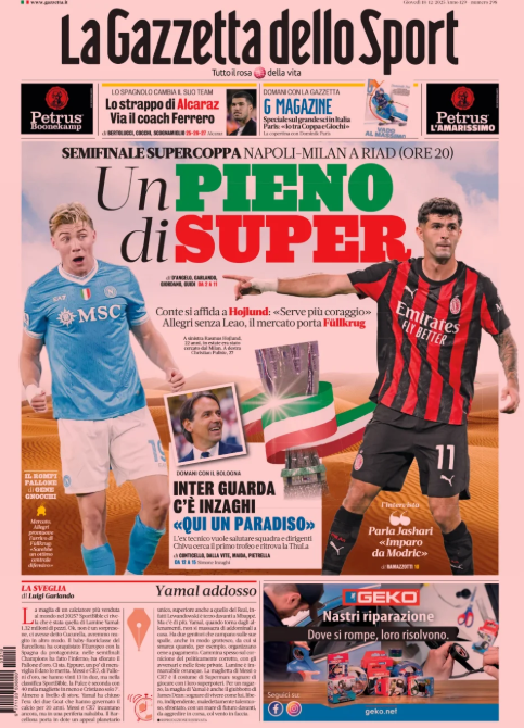 La prima pagina de 'La Gazzetta dello Sport' apre con la Supercoppa Italiana. Napoli-Milan, un pieno di Super. Inter, guarda c'è Inzaghi. Ecco la prima pagina de 'La Gazzetta dello Sport'.