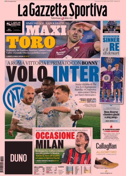 La prima pagina de 'La Gazzetta dello Sport' apre con la vittoria dell'Inter contro la Roma. Il Torino batte il Napoli. Occasione Milan, Loftus-Cheek a rischio. Alla guida contro la Fiorentina c'è Modric. Ecco la prima pagina de 'La Gazzetta dello Sport'.