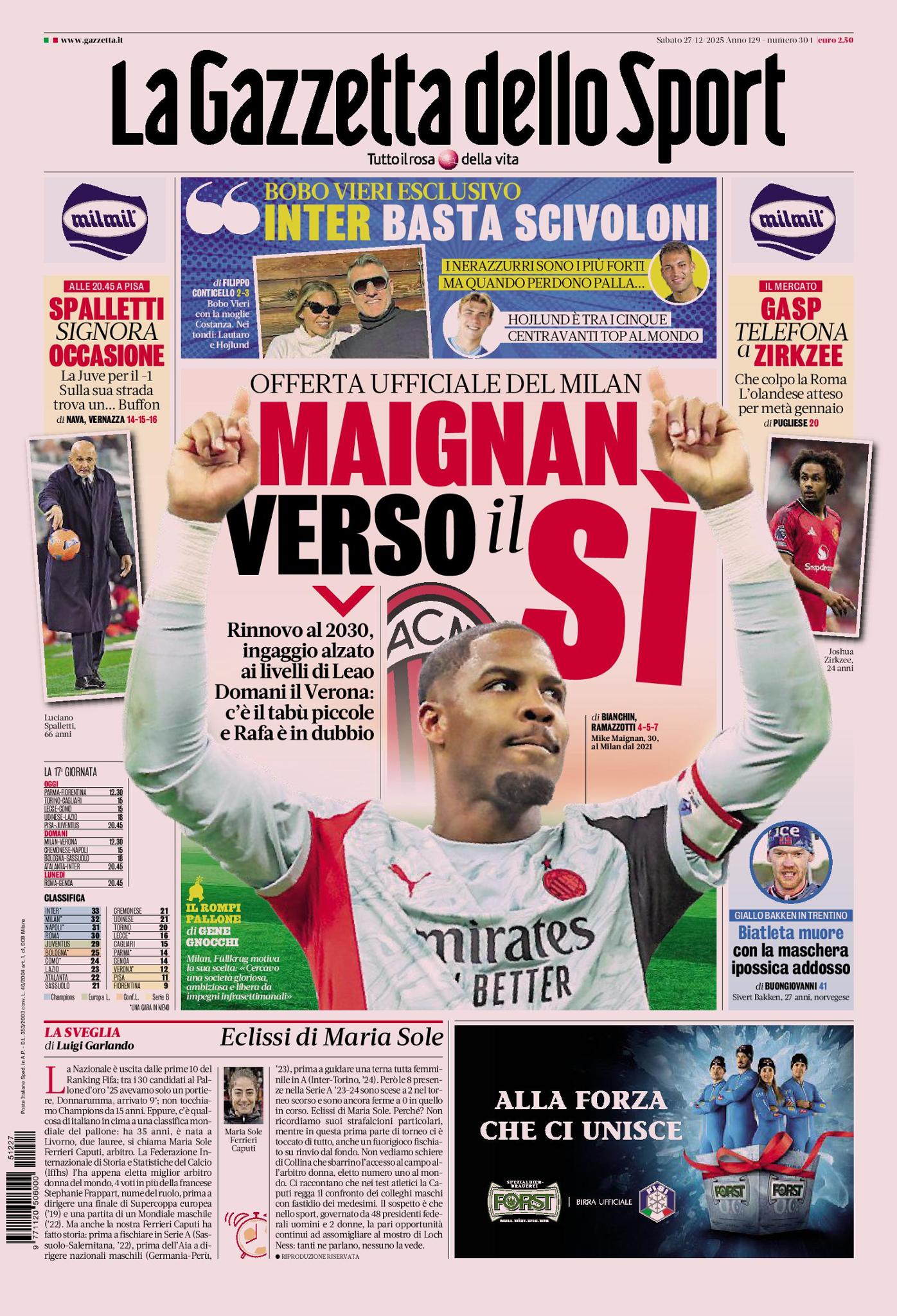 In alto, sotto la testata, un'intervista in esclusiva a Christian Vieri, che parla soprattutto di Inter. Per 'Bobo', i nerazzurri sono i più forti in Serie A. Ma, secondo lui, Rasmus Højlund del Napoli è tra i cinque migliori centravanti al mondo. Si spazia, poi, dai temi del campo a quelli del mercato.