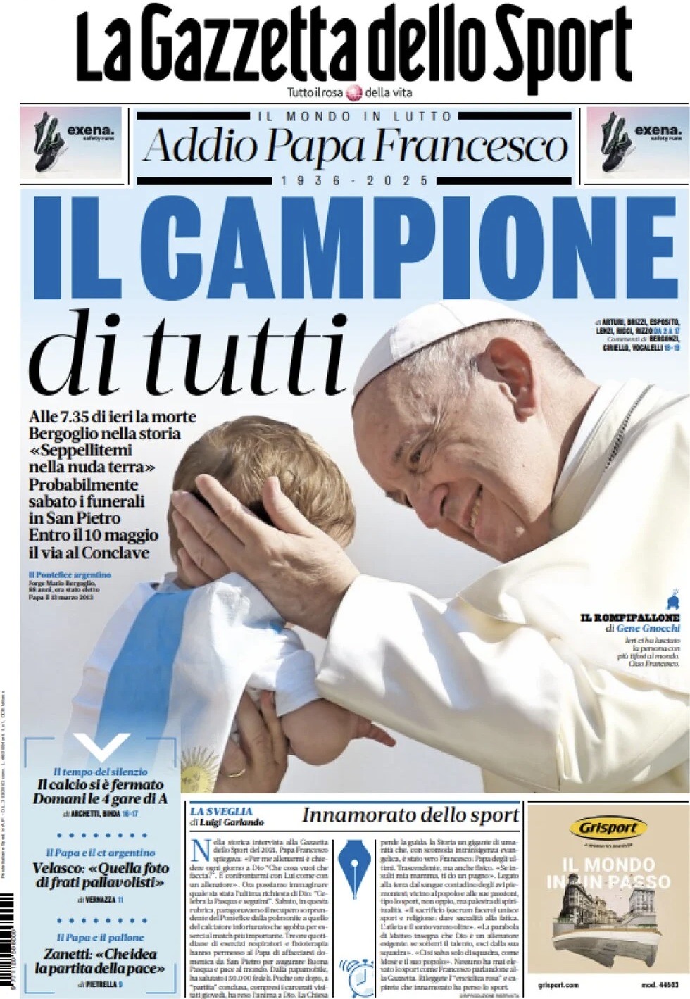 'La Gazzetta dello Sport' oggi in edicola dedica interamente la sua prima pagina alla scomparsa di Papa Francesco, avvenuta ieri mattina alle ore 7:35. Probabilmente sabato 26 aprile i funerali a San Pietro; sarà sepolto "nella nuda terra", come da sua volontà testamentaria.