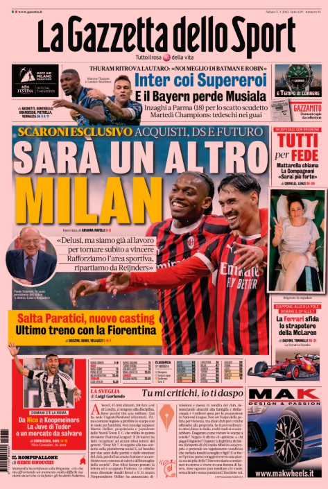 La prima pagina de 'La Gazzetta dello Sport' apre con il futuro dei rossoneri. Parla Scaroni. Sarà un altro Milan. In alto, Inter coi Supereroi. E il Bayern perde Musiala. Da Nico a Koopmeiners, la Juventus di Tudor. Ecco la prima pagina de 'La Gazzetta dello Sport'.