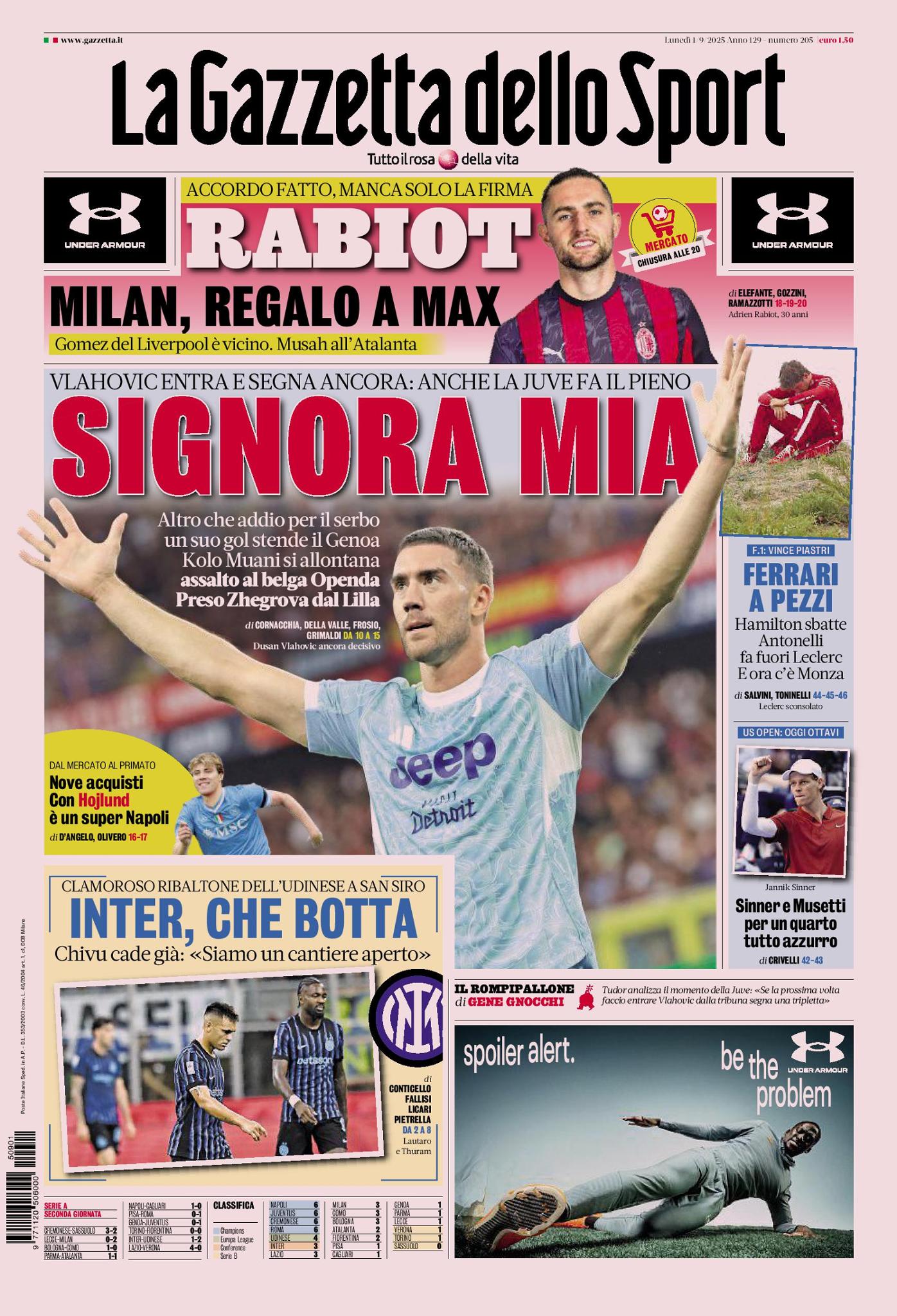 Mentre il Napoli si gode l'arrivo di Rasmus Højlund, il Milan accontenta l'allenatore Massimiliano Allegri e chiude con l'Olympique Marsiglia per Adrien Rabiot: ai francesi 10 milioni di euro. Vicino l'arrivo di Joe Gomez dal Liverpool, mentre Yunus Musah si trasferisce all'Atalanta. Tornando, invece, al campionato, sconfitta interna (1-2) per l'Inter di Cristian Chivu contro l'Udinese: brutta botta. E il tecnico rumeno spiega: "Siamo un cantiere aperto".