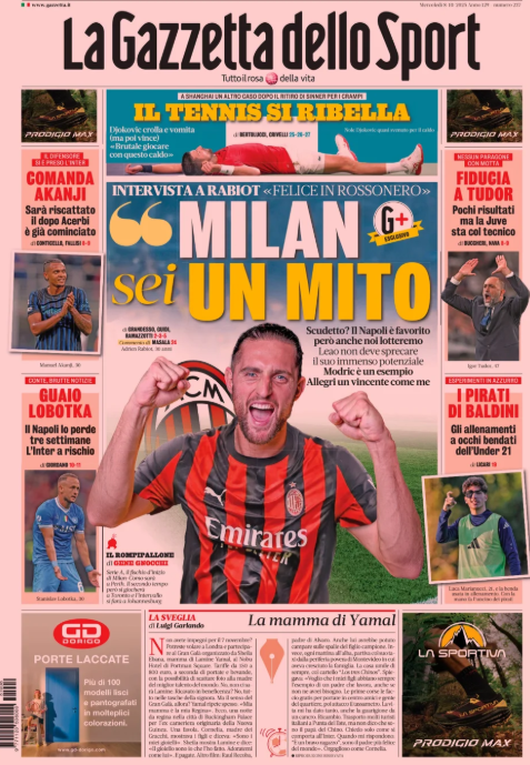 La prima pagina de 'La Gazzetta dello Sport' apre con l'intervista a Rabiot: "Milan sei un mito". Inter, comanda Akanji. Juventus, fiducia a Tudor. Napoli, guaio Lobotka. I pirati di Baldini. Ecco la prima pagina de 'La Gazzetta dello Sport'.