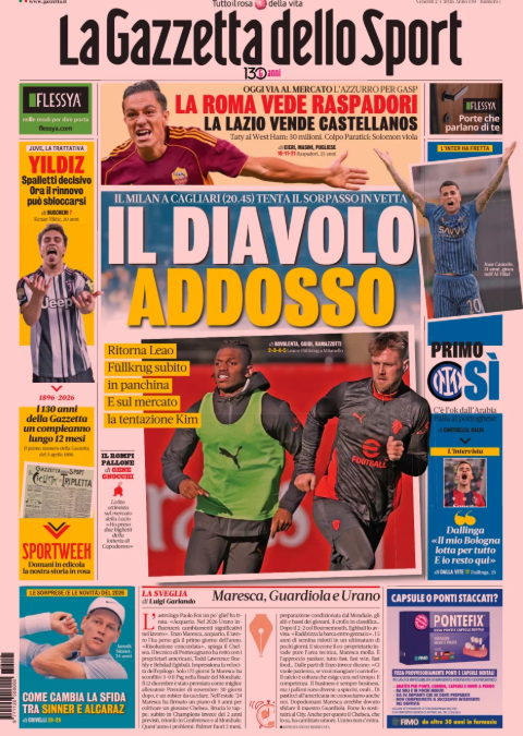 La prima pagina de 'La Gazzetta dello Sport' apre con il Milan a Cagliari. Il Diavolo addosso. Ritorna Leao, Fullkrug in panchina. E sul mercato tentazione Kim. La Roma vede Raspadori, la Lazio vende Castellanos. Yildiz rinnovo si può sbloccare. Primo si per Cancelo all'Inter. Ecco la prima pagina de 'La Gazzetta dello Sport'.