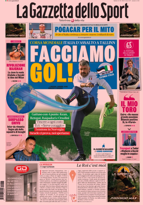 La prima pagina de 'La Gazzetta dello Sport' apre con la partita tra Italia ed Estonia: "Facciamo gol". Spazio al Milan: "Rivoluzione Maignan. Atubolu o Suzuki per il Milan". Cario parla del Torino. Inter da rimonta, sorpasso Chivu. Trezeguet consiglia Tuodr. Ecco la prima pagina de 'La Gazzetta dello Sport'.