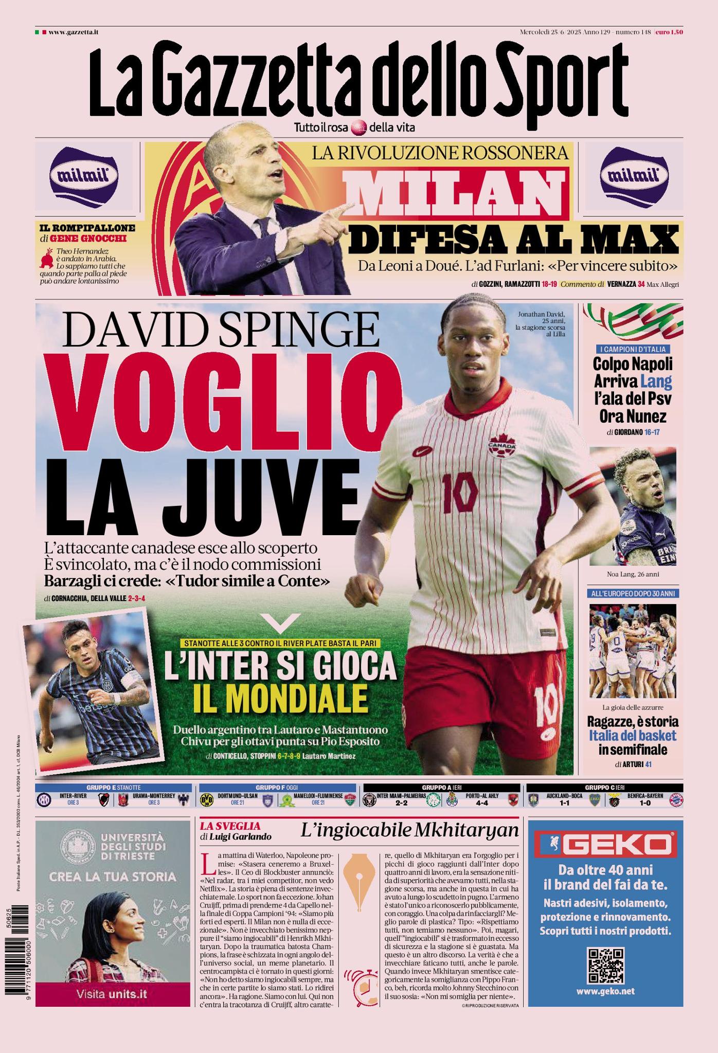 In alto, sotto la testata, si parla dei movimenti di mercato del nuovo Milan di Massimiliano Allegri: difesa da rinforzare, con Giovanni Leoni (Parma) e Guéla Doué (Strasburgo) tra gli obiettivi principali. Colpo del Napoli, che prende l'esterno offensivo Noa Lang dal PSV Eindhoven e ora ci proverà per il colpo Darwin Núñez dal Liverpool.
