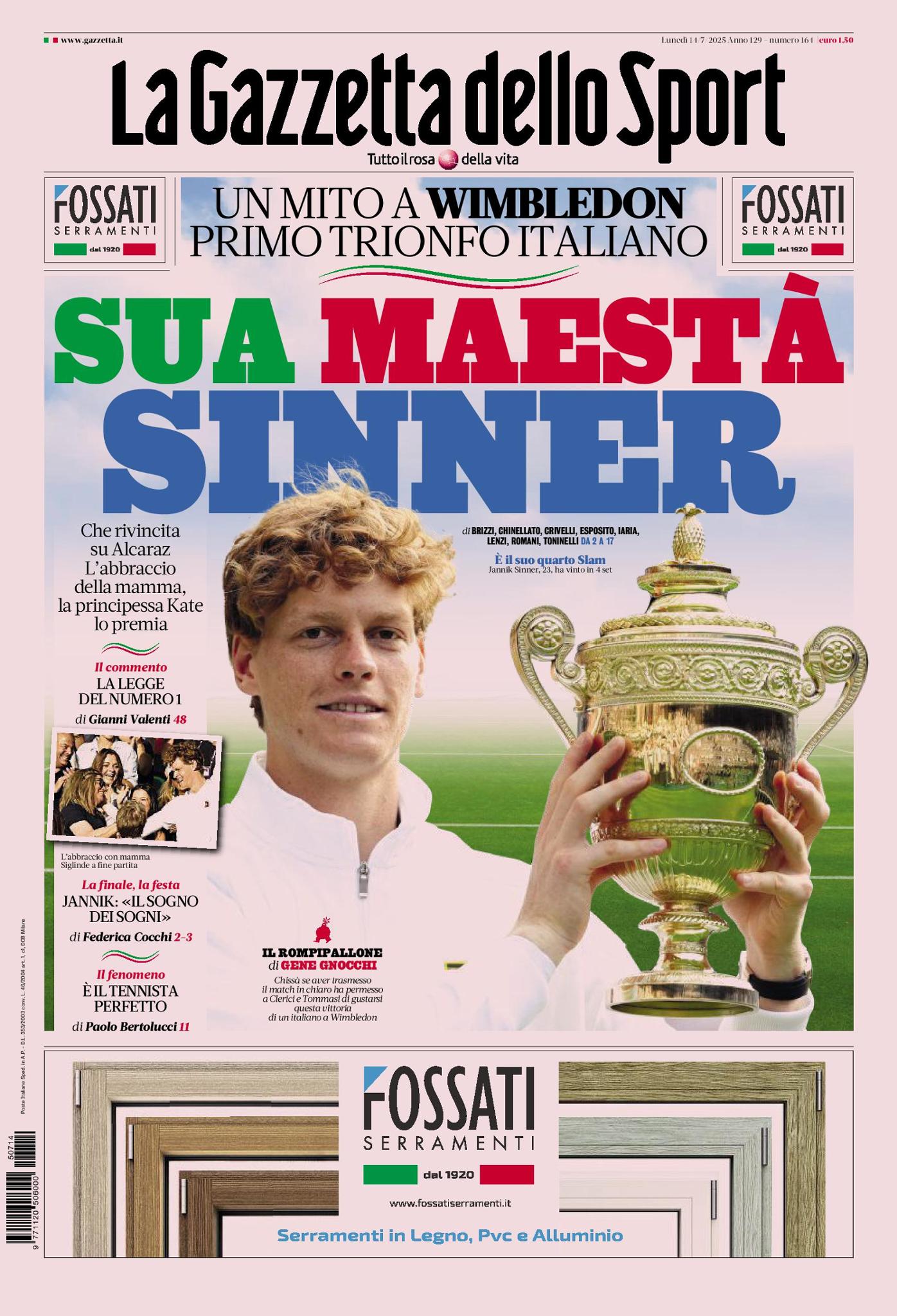 'La Gazzetta dello Sport' oggi in edicola dedica la sua copertina al tennis e alla vittoria di Jannik Sinner nel prestigioso torneo di Wimbledon. In finale battuto per 3-1 lo spagnolo Carlos Alcaraz: l'altoatesino si prende la rivincita sulla sconfitta di Parigi ed è il primo italiano della storia a vincere, in singolo, il torneo londinese.