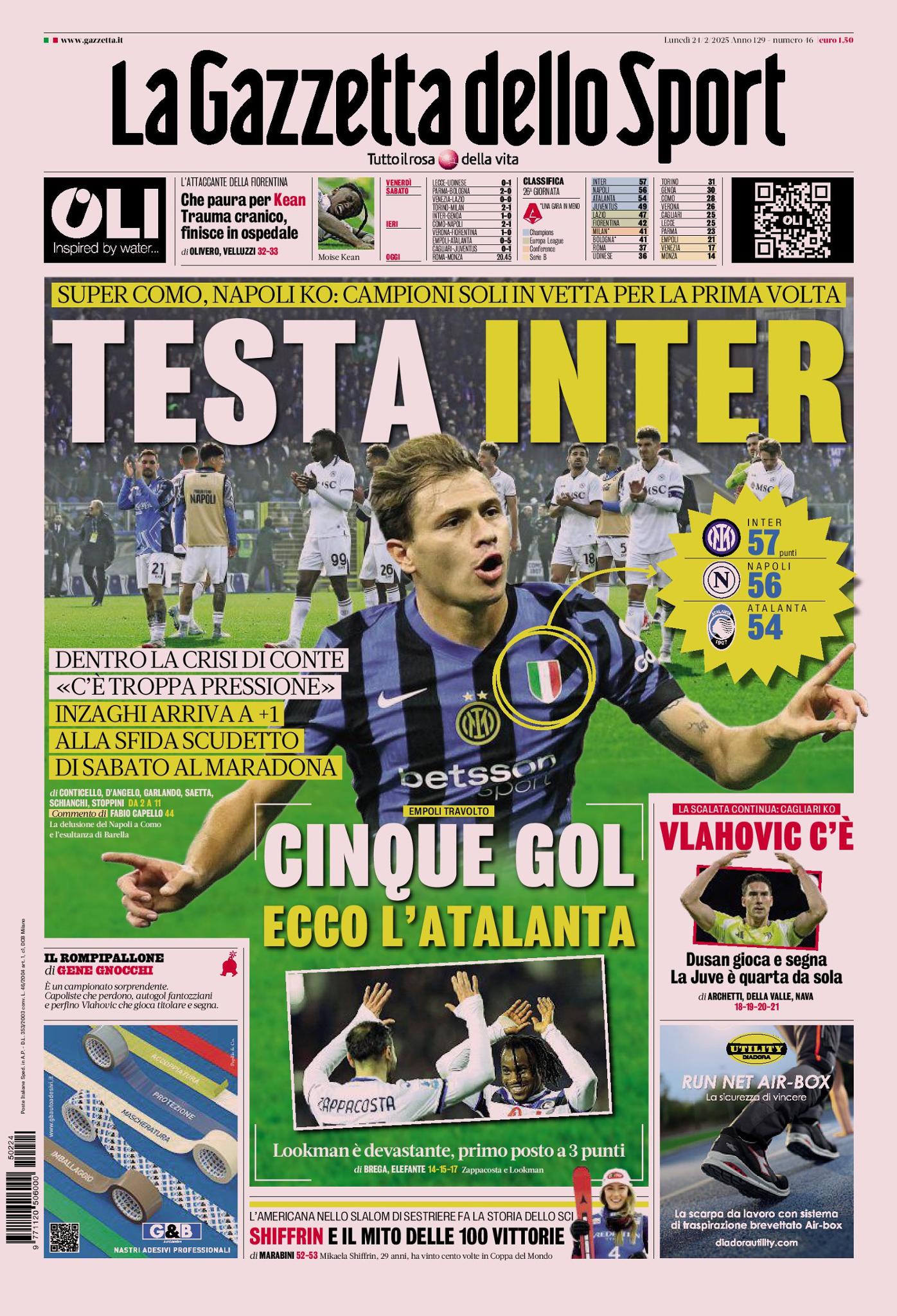 Intanto, però, si avvicina l'Atalanta, terza in graduatoria in Serie A, ma a 54 punti e distante solo 3 lunghezze. Roboante 0-5 sul terreno dell'Empoli con doppietta di un devastante Ademola Lookman. Al quarto posto, da sola, troviamo la Juventus di Thiago Motta, che passa (0-1) alla 'Unipol Domus' di Cagliari grazie ad un gol di Dušan Vlahović, titolare dopo quasi un mese.