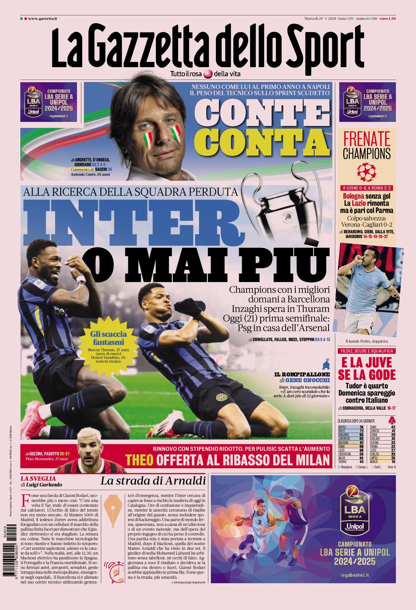 In alto, sotto la testata, si parla del Napoli capolista del campionato e di quanto conti, in panchina, avere uno come Antonio Conte. Mai nessuno come il salentino sulla panchina dei campani al primo anno: qualcosa vorrà pur dire. Nei posticipi della 34^ giornata della Serie A 2024-2025, ieri, Verona-Cagliari 0-2 in zona salvezza. Per la lotta per un posto in Champions, invece, da segnalare due pareggi in Udinese-Bologna (0-0) e Lazio-Parma (2-2).