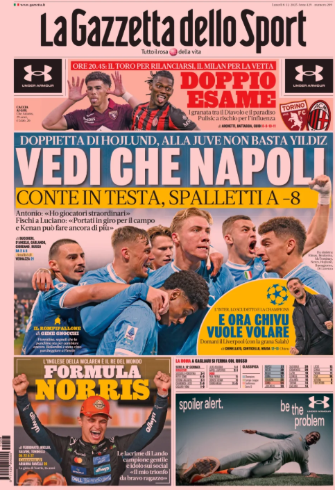 Questa è la prima pagina de 'La Gazzetta dello Sport', in edicola oggi, lunedì 8 dicembre 2025. Diamo un’occhiata alle principali novità sul mondo dello sport e in particolare del calcio, cercando di evidenziare le notizie sul Milan.