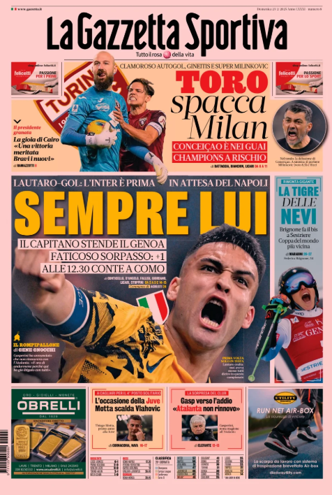 La prima pagina de 'La Gazzetta dello Sport' apre con la Serie A. Lautaro Martinez gol. Inter prima in attesa del Napoli. Sempre lui. Toro spacca Milan. Conceicao è nei guai. Champions a rischio. Gasperini verso l'addio all'Atalanta. L'occasione della Juventus. Ecco la prima pagina de 'La Gazzetta dello Sport'.