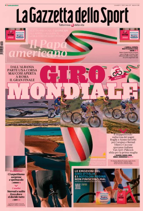 La prima pagina de 'La Gazzetta dello Sport' apre con il Giro d'Italia. Giro Mondiale. Dall'Albania parte una corsa mai così aperta. Il Papa americano. . Ecco la prima pagina de 'La Gazzetta dello Sport'.